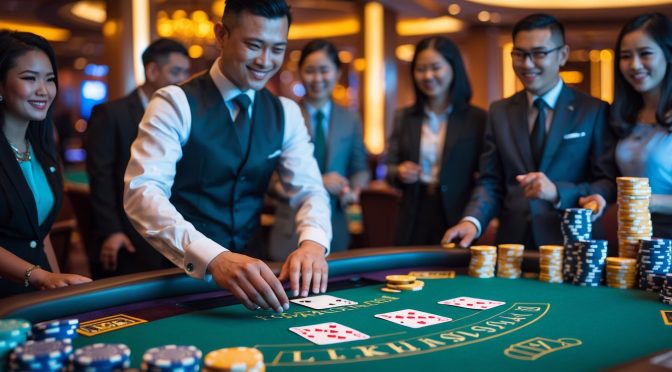 Meja blackjack dengan dealer dan pemain yang sedang bermain kartu di kasino di Indonesia.