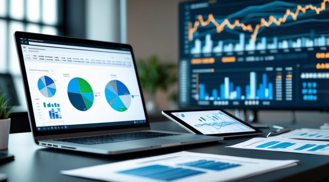 Sebuah ruang kerja modern dengan laptop dan tablet yang menampilkan grafik dan data statistik, serta layar besar di latar belakang yang menunjukkan visualisasi data.
